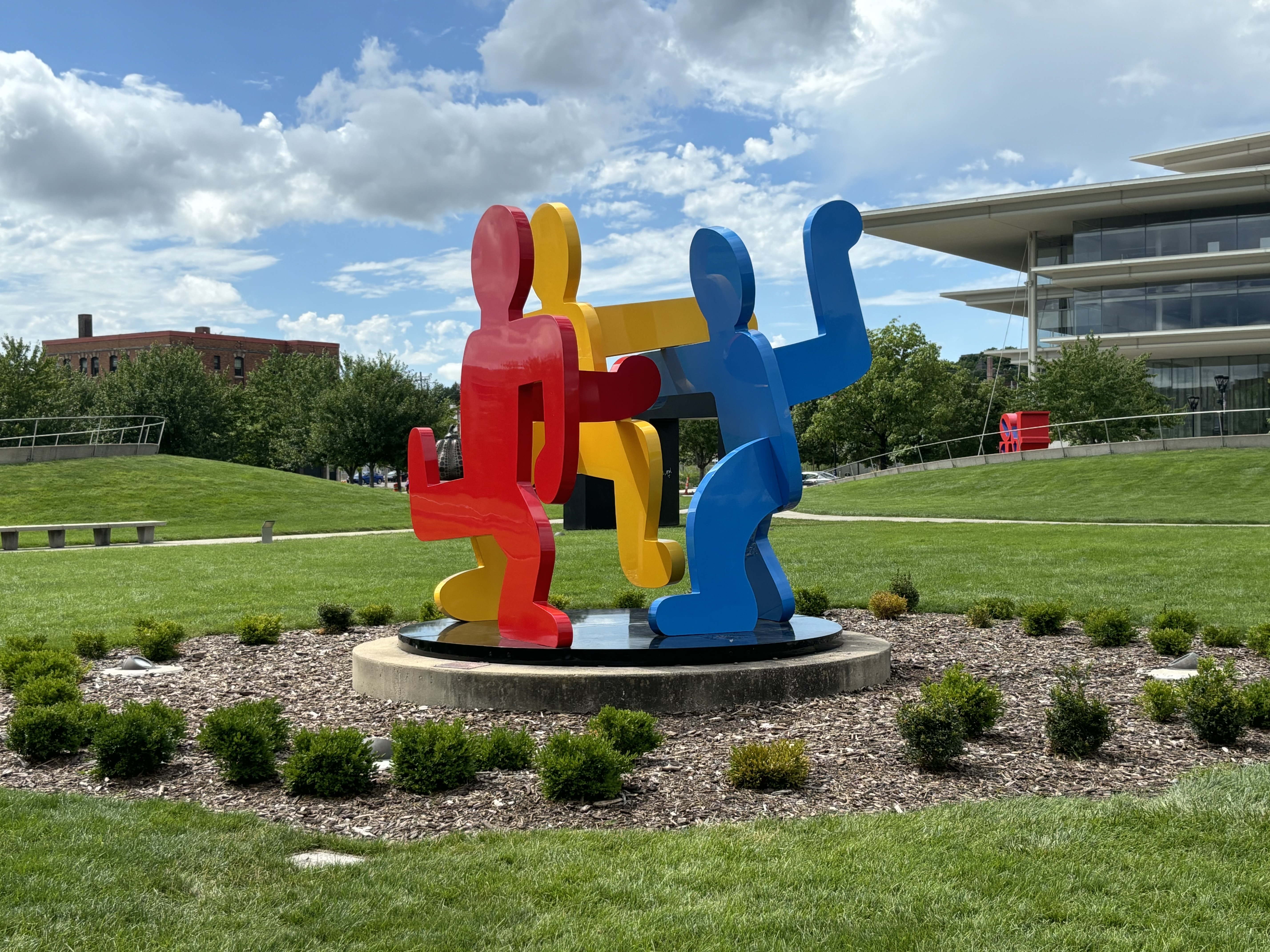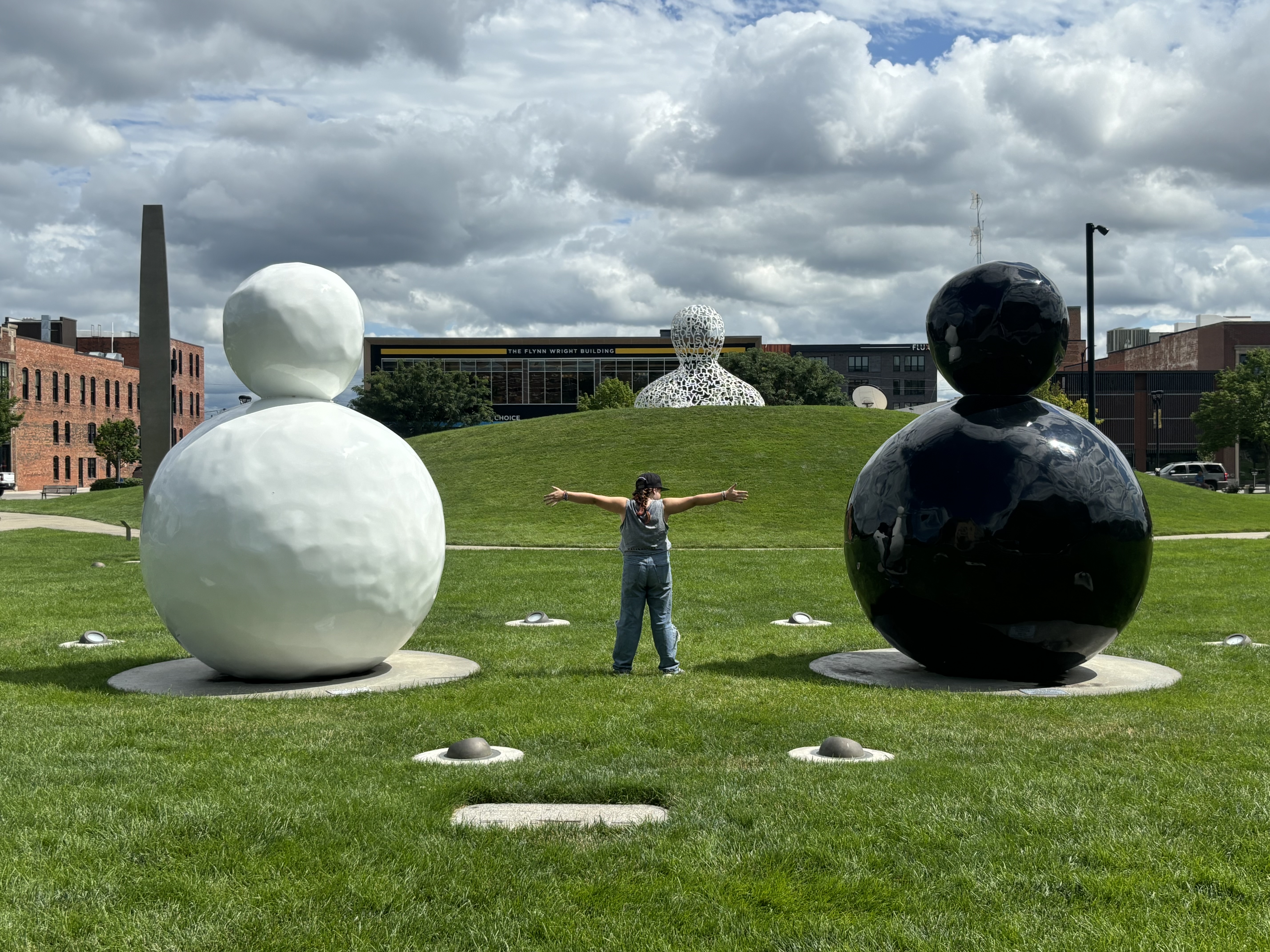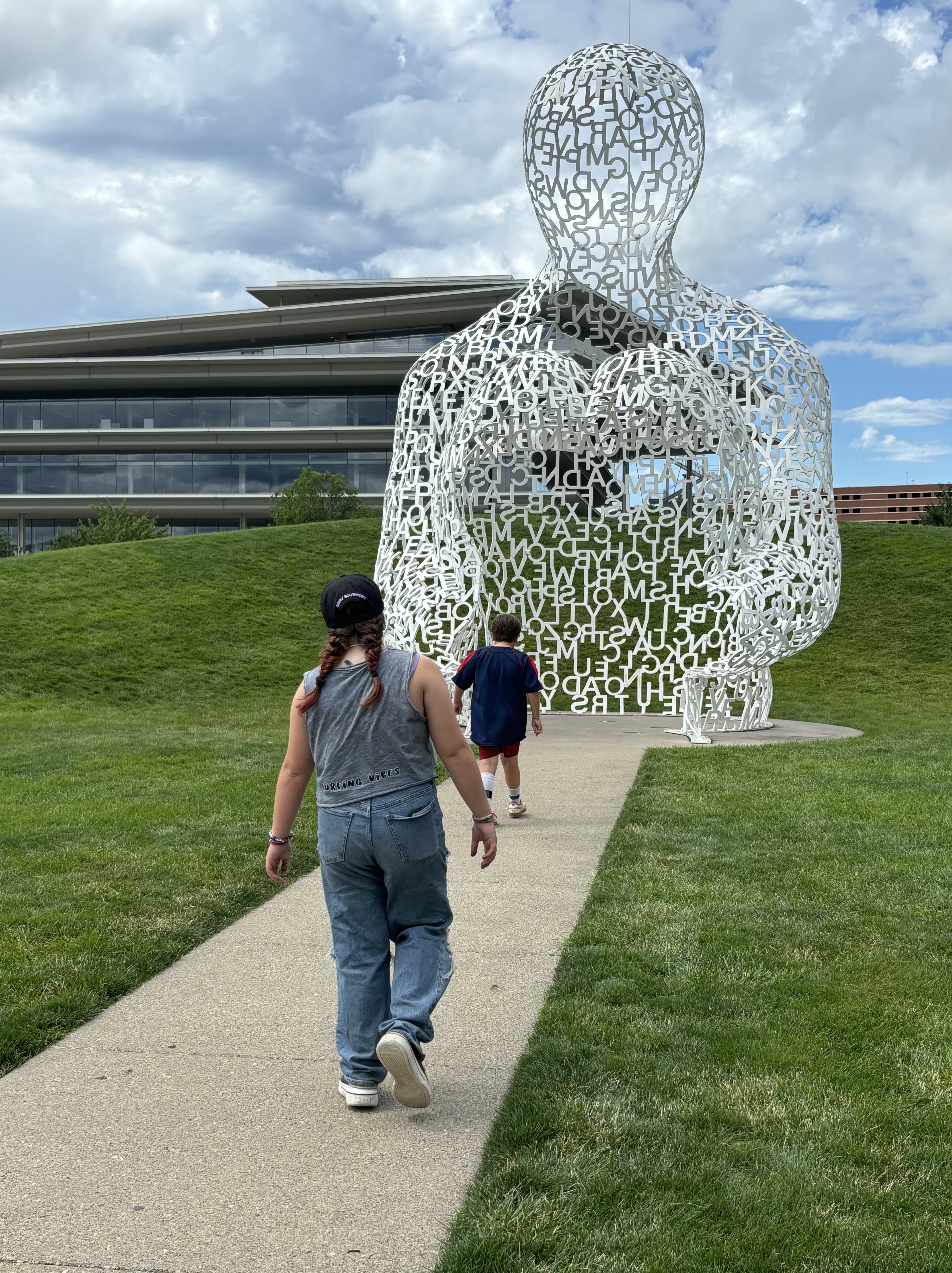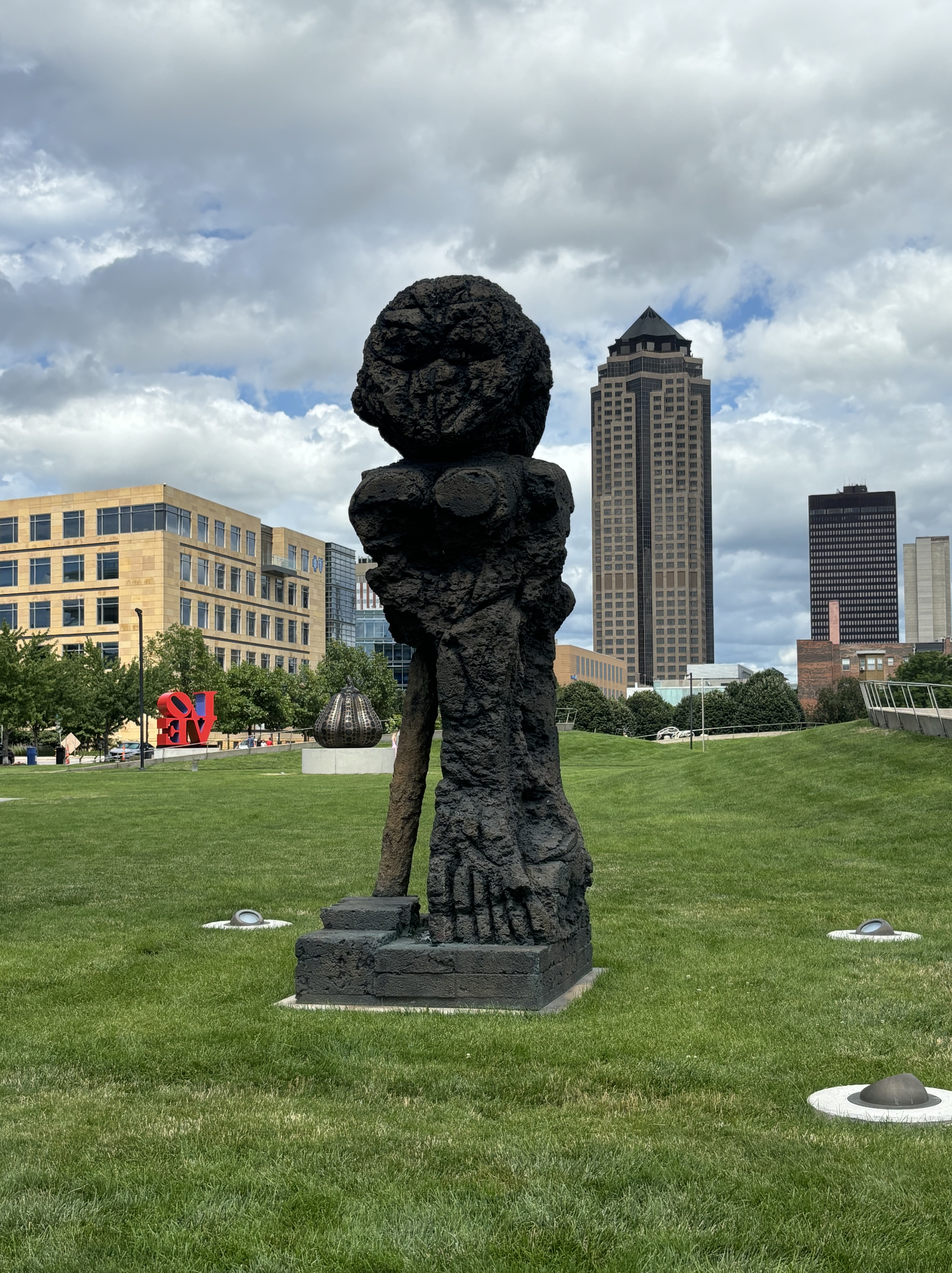 After leaving Kansas we headed to Iowa where we stopped at the Pappajohn Sculpture Park. And to answer your question, no, it has nothing to do with the pizza company. The sculptors are made by various artists and were so neat to explore. My favorite was the large person made out of letters and the kids both really liked the spider. Vinny really liked the skinny bunny.