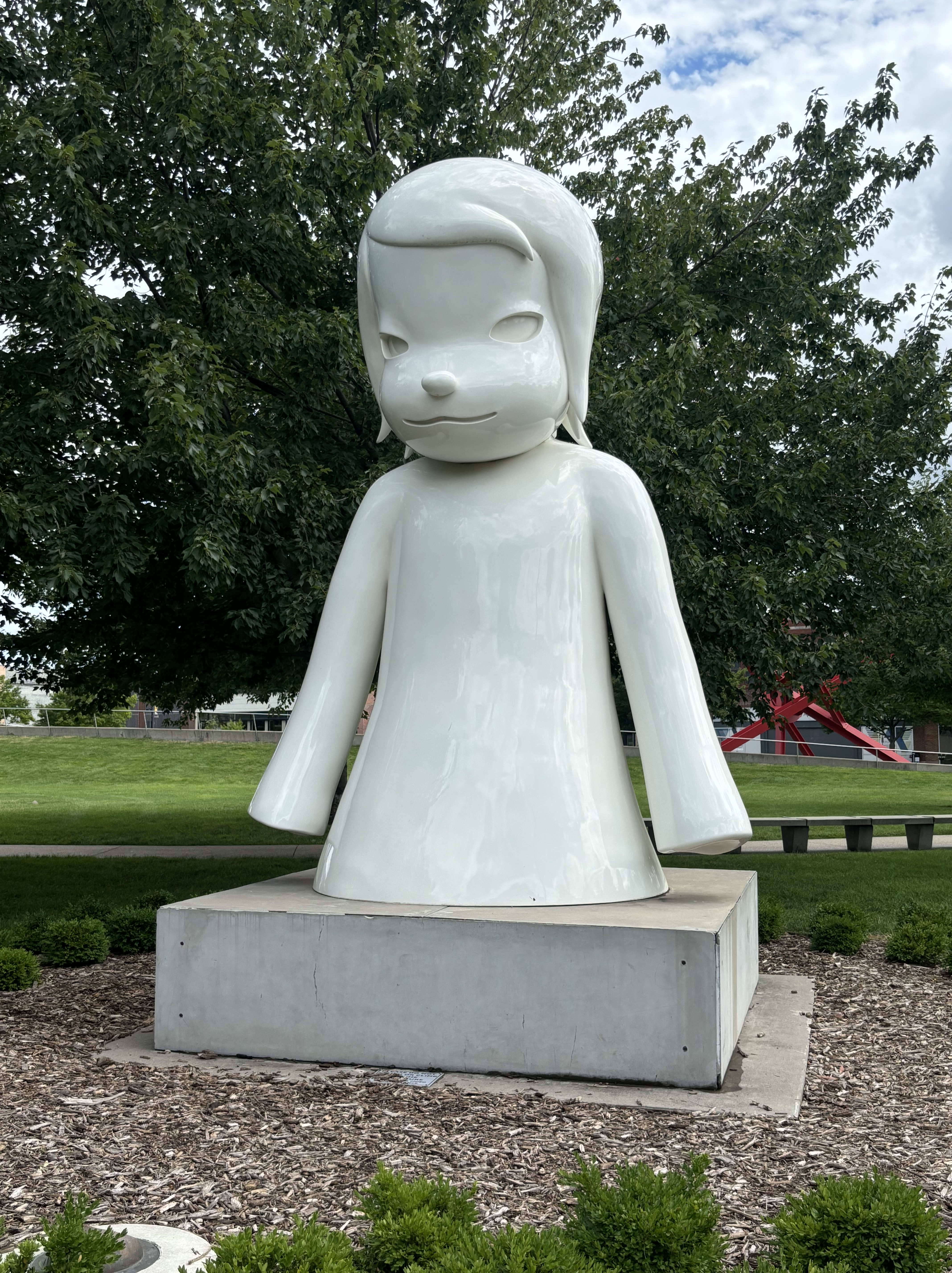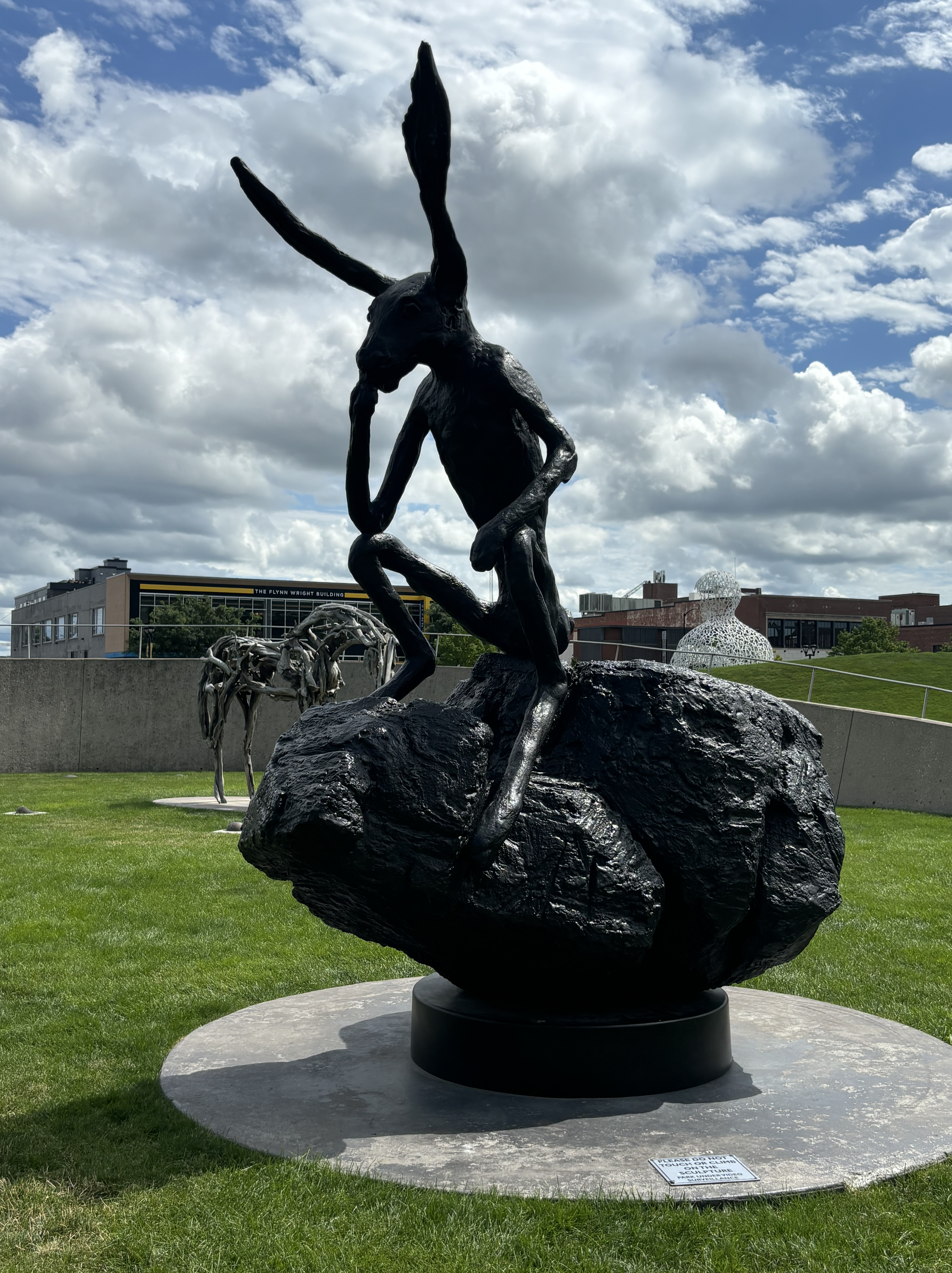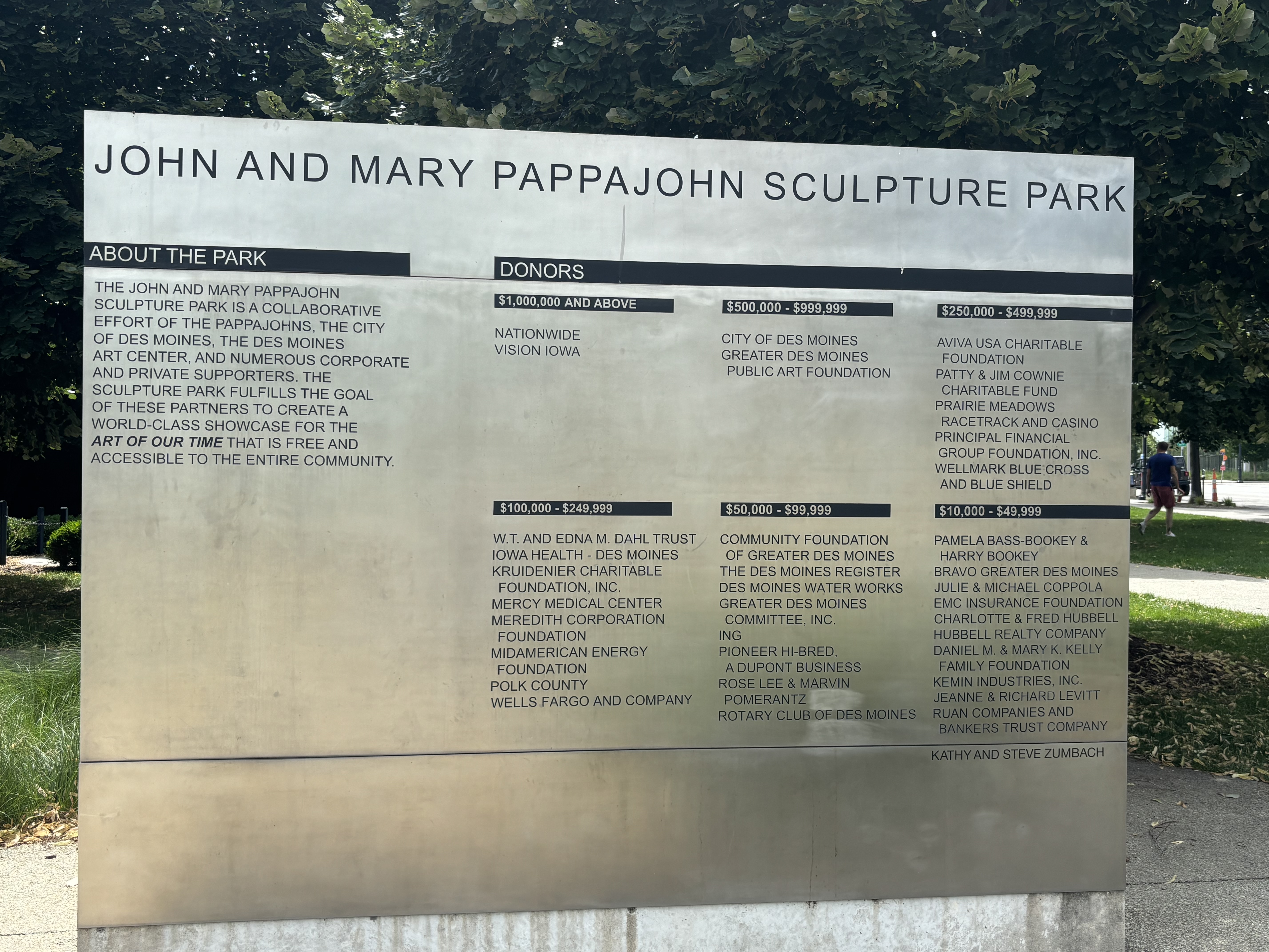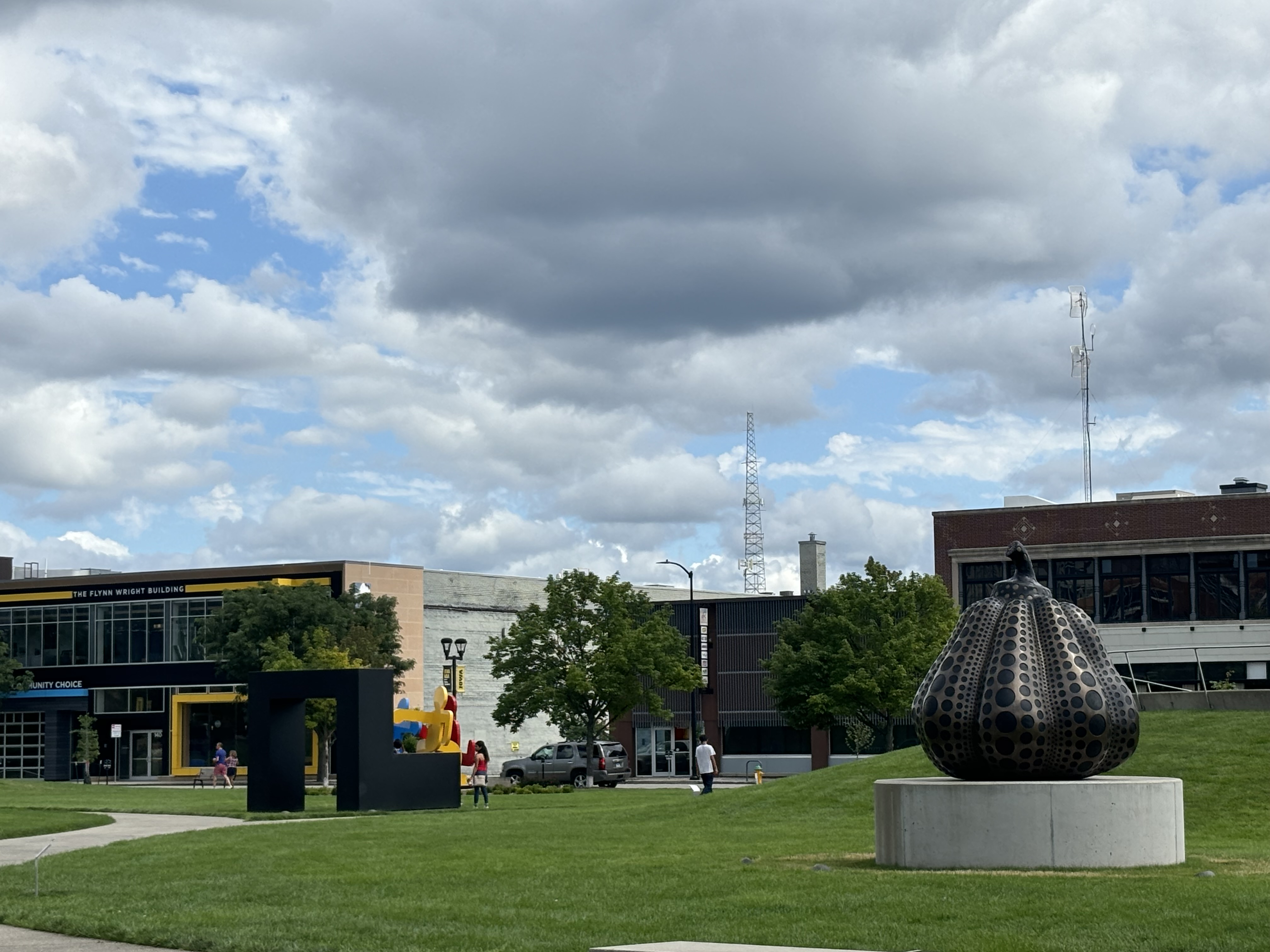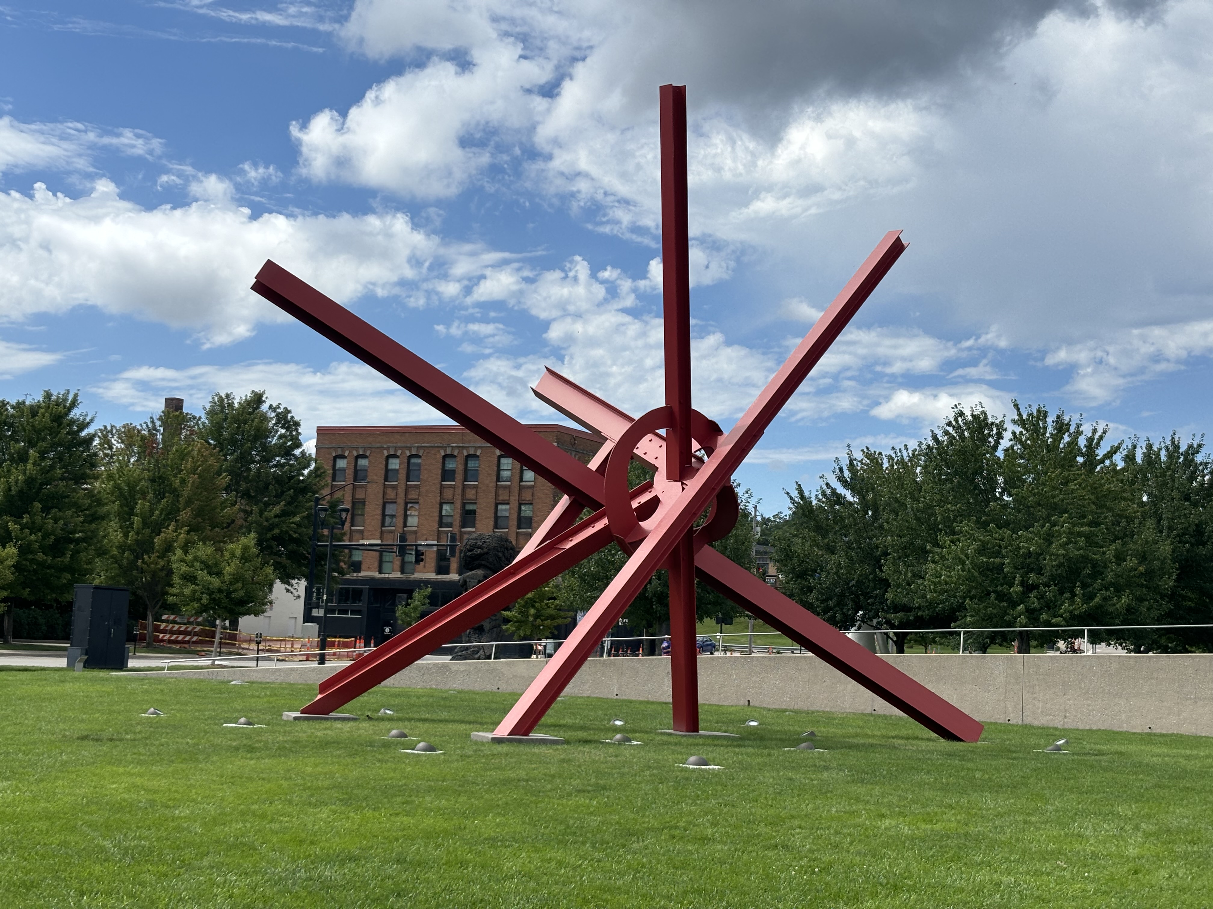 After leaving Kansas we headed to Iowa where we stopped at the Pappajohn Sculpture Park. And to answer your question, no, it has nothing to do with the pizza company. The sculptors are made by various artists and were so neat to explore. My favorite was the large person made out of letters and the kids both really liked the spider. Vinny really liked the skinny bunny.